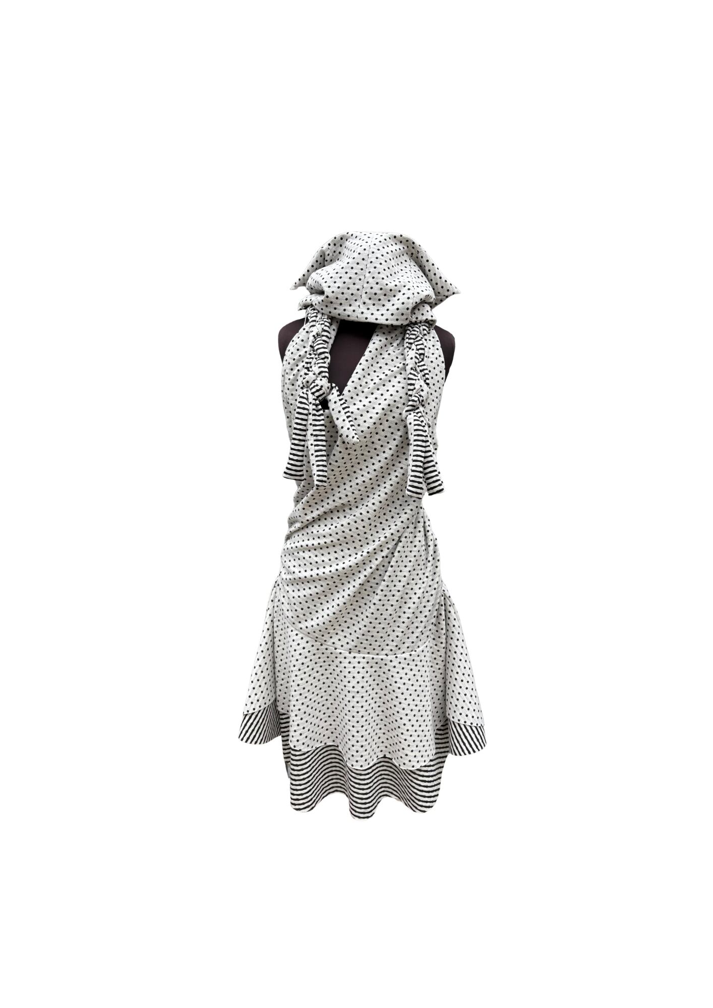 ドットとストライプを組み合わせた生地で仕立てた、